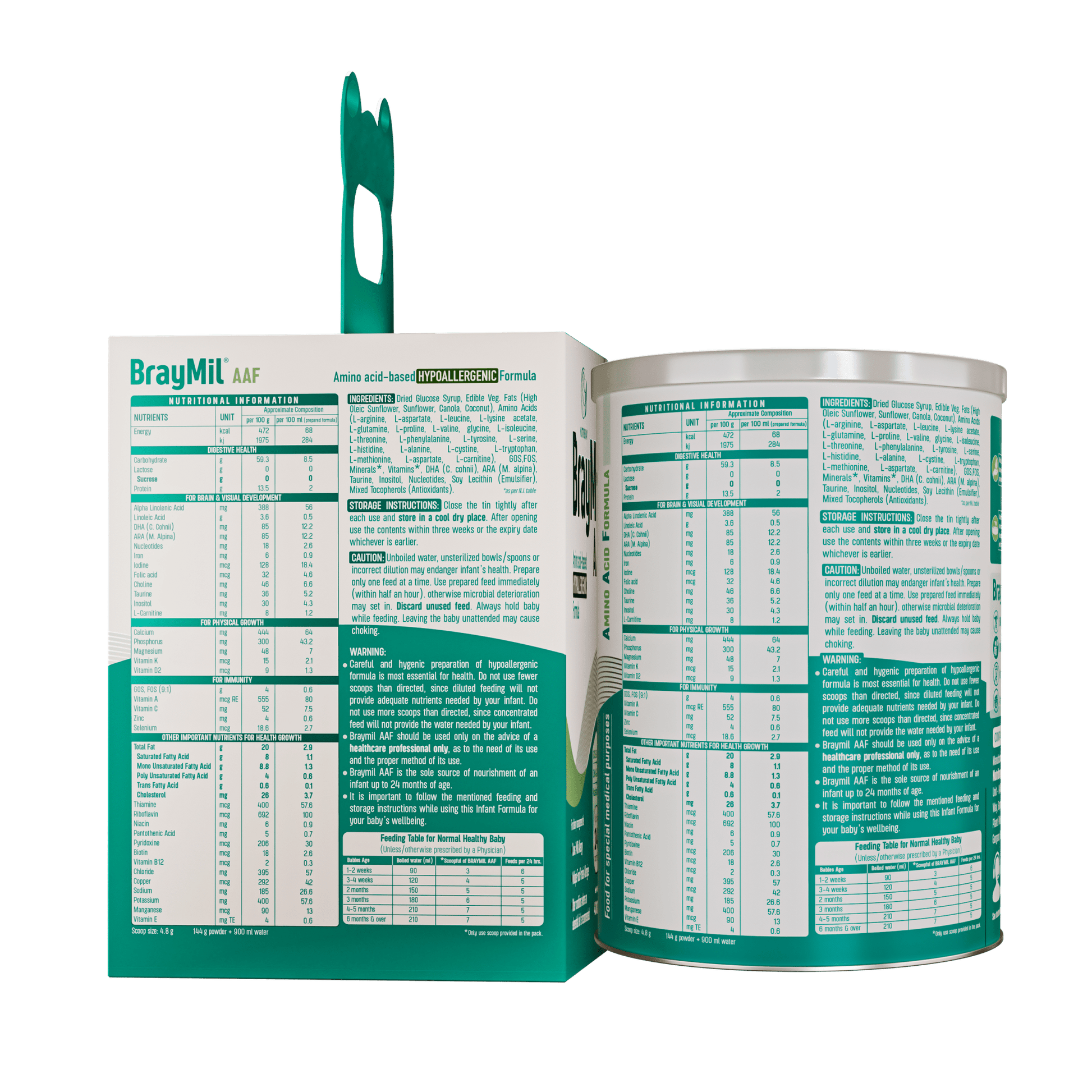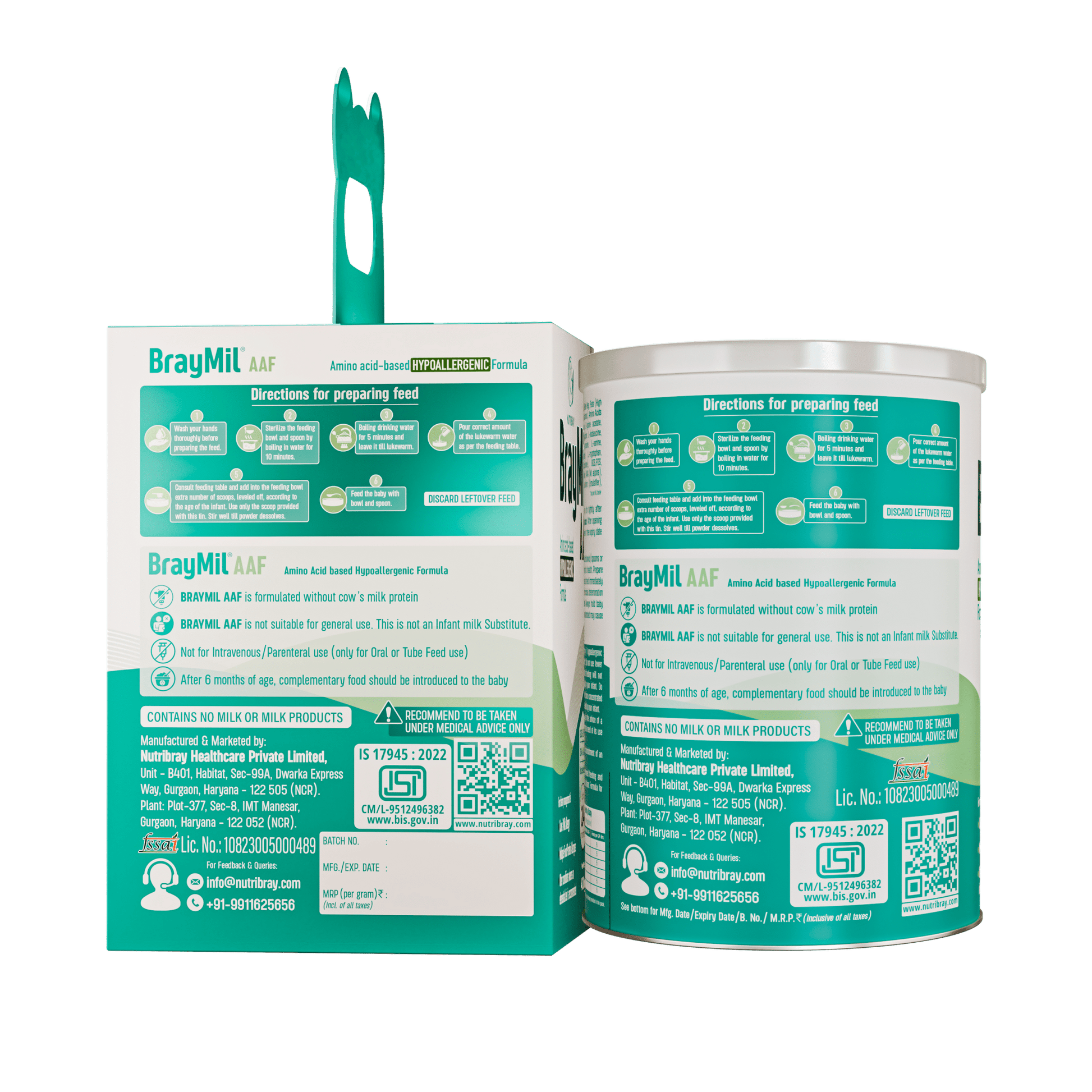 BrayMil® AAF by Nutribray is a scientifically formulated amino acid-based hypoallergenic formula designed for infants with Cow’s Milk Allergy (CMA), Multiple Food Protein Allergies (MFPA), or other conditions where an elemental diet is recommended.