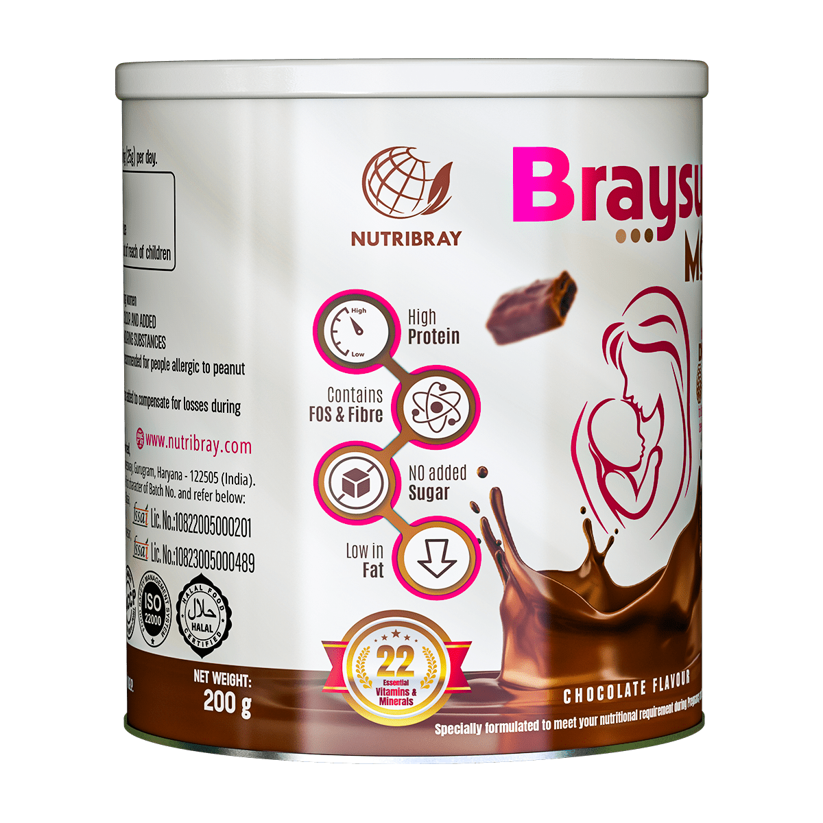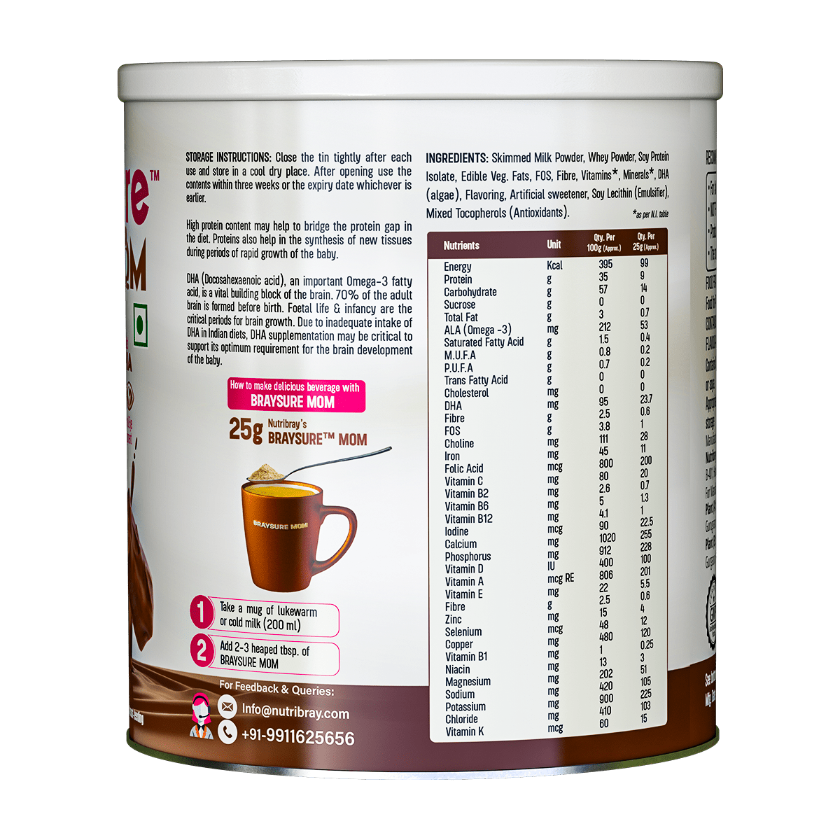 Braysure Mom Powder is a health supplement with high protein content, specially formulated for pregnant and breastfeeding women. It helps bridge the dietary protein gap and supports tissue synthesis during the baby’s rapid growth phase. Enriched with DHA – an omega-3 fatty acid essential for brain development – this supplement helps meet the increased nutritional demands during pregnancy and lactation.
